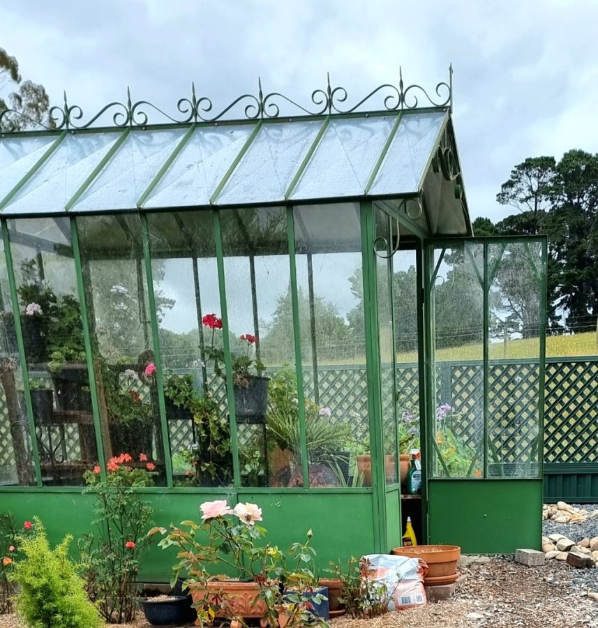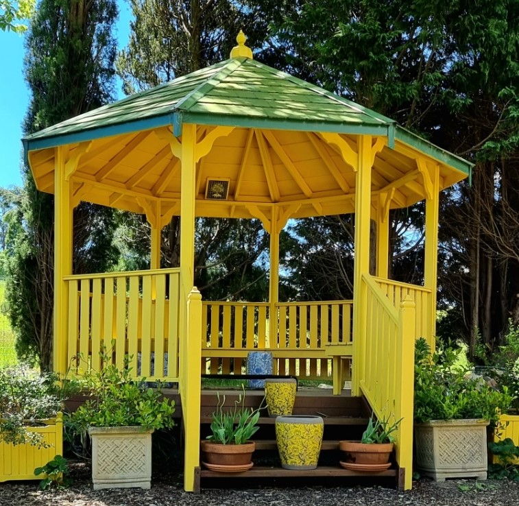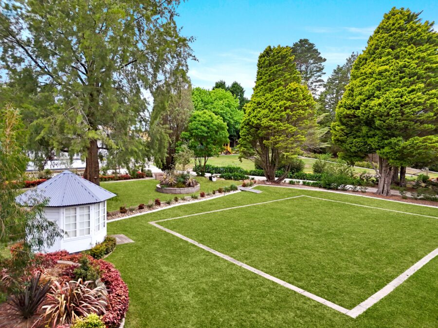 In the front garden, a picturesque Croquet hut looks onto the croquet lawn. It has openable windows, French doors, wooden walls and a wooden cathedral ceiling beneath a Colorbond roof.
