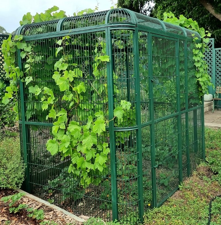 A walled orchard contains an ornate wrought iron aviary in which 4 varieties of grapes are grown. The aviary is to keep the birds out, not in.