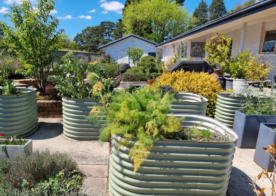The fruit and nut trees in the garden include lemons, cumquats, mandarins, grapes, pomegranate, almond, pine nuts, olives, apples, cherries, fig, olives, peach, apricot, nectarine, plums, nashi pear. There are also blackberries in containers to stop spreading and lots of strawberry plants.
