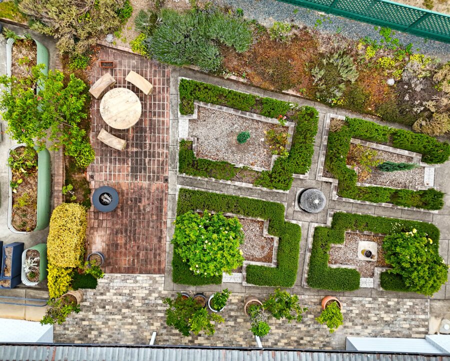 The garden has extensive above and below ground drainage which discharges into council drains. The above ground drainage of swales and a water garden has been enhanced with pebbles, plants and decorative grasses. Areas of the garden are also irrigated.